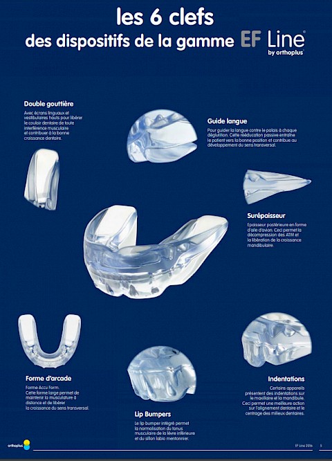 Les appareils d’éducation fonctionnelle de la gamme Éducateur Fonctionel sont des dispositifs médicaux amovible de type mono-bloc comportant un Guide langue pour le repositionnement de la langue au palais à chaque déglutition.